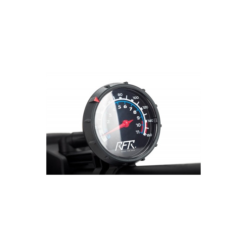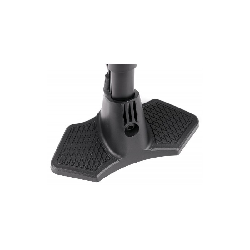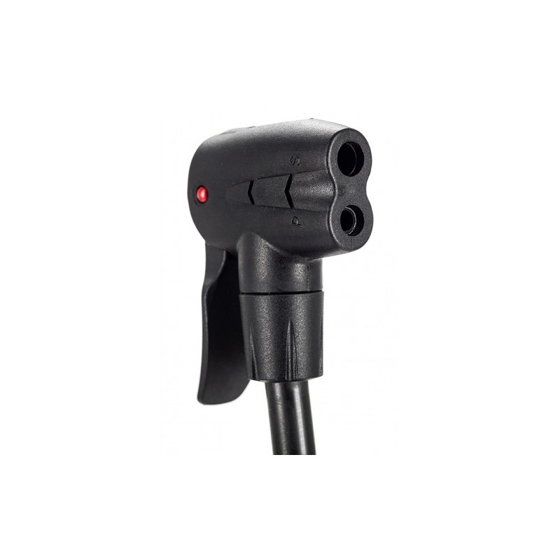 Presta and Schrader valve head with quick-release lever; plastic base with integrated pressure gauge; 160 psi max.
